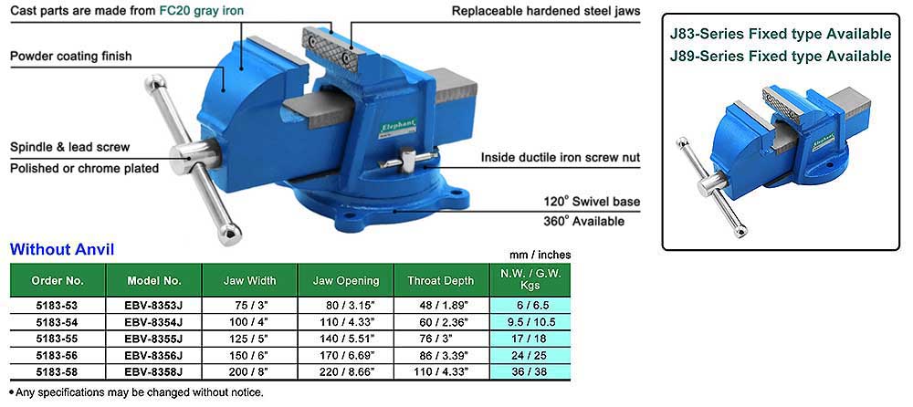 J83-Series HEAVY DUTY SWIVEL BENCH VISE WITHOUT ANVIL