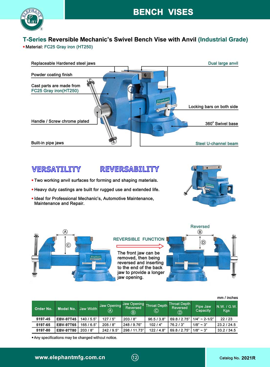 T-Series REVERSIBLE MECHANICS SWIVEL BENCH VISE WITH ANVIL